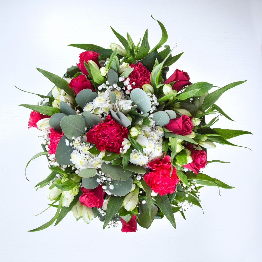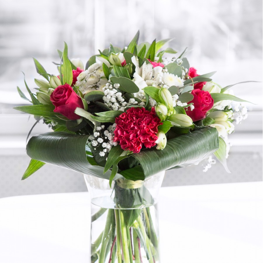 Enhance your space with the beautiful and unique design of our flower arrangement. This bouquet includes sweet white chrysanthemums, delicate gypsophila, vibrant red roses, lively carnations, elegant white alstroemeria, and rich aspidistra leaves.